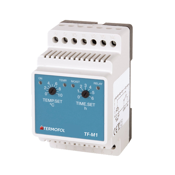 Termoregulator TF-M1 służy do sterowania elektrycznymi systemami grzewczymi przeznaczonymi do ochrony przed lodem i śniegiem (np. ochrona rynien i rur spustowych, zabezpieczenie podjazdów przed pojawieniem się oblodzenia, zapobieganie gromadzeniu się śniegu na dachach, ochrona przeciwoblodzeniowa schodów itp.) Daje możliwość kontroli przeciwoblodzeniowej jednej strefy. Sterowanie manualne za pomocą pokręteł. Nie posiada możliwości programowania. Sposób montażu: na szynie DIN. Sygnalizacja za pomocą diod.