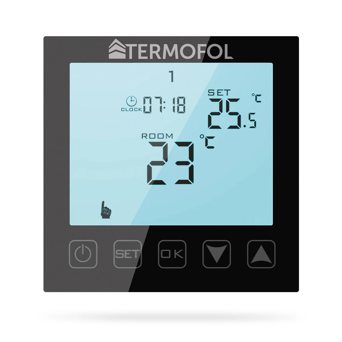 TERMOFOL TF-H1 Mark II to nowoczesny, w pełni programowalny podtynkowy termoregulator, wyposażony w panel sterujący LED, przeznaczony do sterowania elektrycznymi systemami grzewczymi. Termostat odczytuje temperaturę z czujnika podłogi oraz powietrza. Ekran ma niebieskie podświetlenie, które jest wyjątkowo czytelne.